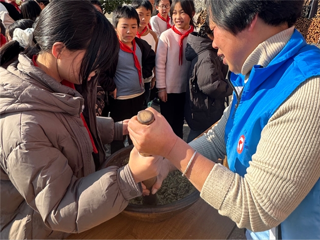活动设在樟溪乡文化站的戏台旁,几张长桌上摆好了擂钵、擂棍、芝麻、花生、茶叶等原料,乡里请来了经验丰富的吴阿姨指导学生。“擂茶要先放茶叶和芝麻,擂的时候得顺时针转,力气要匀——”吴阿姨一边示范,一边握着学生的手教握擂棍的姿势。孩子们围成一圈,眼睛盯着擂钵里慢慢变成碎末的原料,有的踮着脚凑上去闻,有的学着吴阿姨的样子使劲捣,不一会儿就额头冒了汗:“原来擂茶这么费力气呀!”