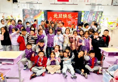 教室里洋溢着节日的喜庆,紫色的地胶上坐满了身着校服的二年级学生,他们高举双手比着 “耶”,黑板上 “祝大家元旦快乐” 的红色标语与彩虹、花朵装饰相映成趣,后排同学的笑脸挤在一起,定格下这场盛会的第一张合影。