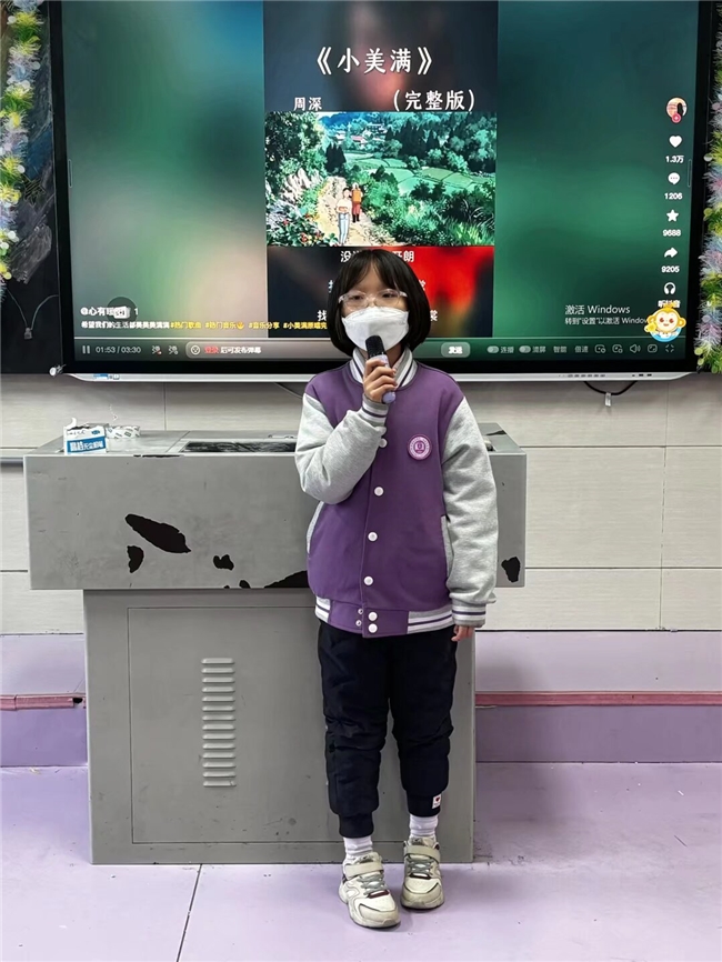 紫色校服的小女孩站在讲台前,手持麦克风演唱《小美满》,身后大屏幕播放着青山绿水的背景,口罩也挡不住她投入的神情,台下同学静静聆听这清澈的童声。