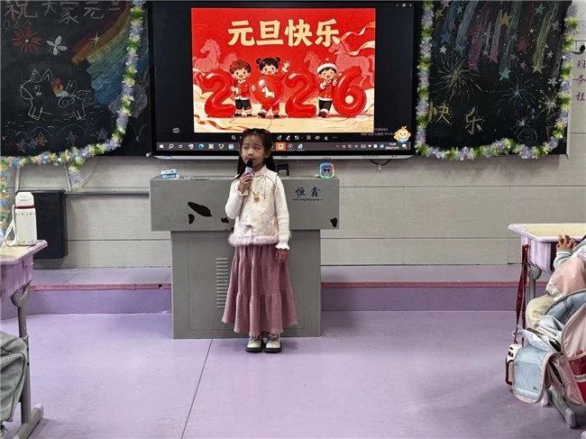 白色刺绣上衣搭配粉色百褶裙的小女孩,手持麦克风站在讲台前,身后屏幕上的卡通娃娃举着 “2026” 字样,传统服饰与新年氛围碰撞出别样精彩。