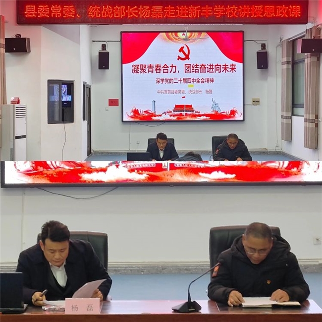 为引导青少年树立正确的世界观,人生观,推动“大思政课”建设走深走实,2026年1月5日,宜黄县新丰学校党支部特邀县委常委、统战部部长杨磊走进校园,为学校全体党员、思政课教师及初三学子带来一堂思想深刻、内涵丰富的思政课。本次活动由学校党支部书记、校长何国忠主持。