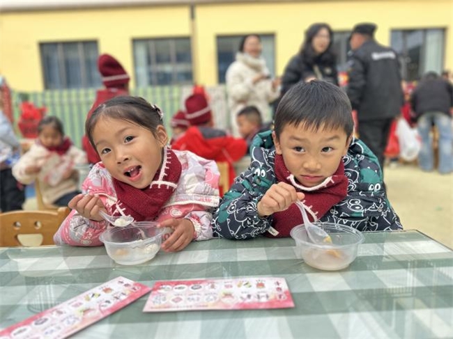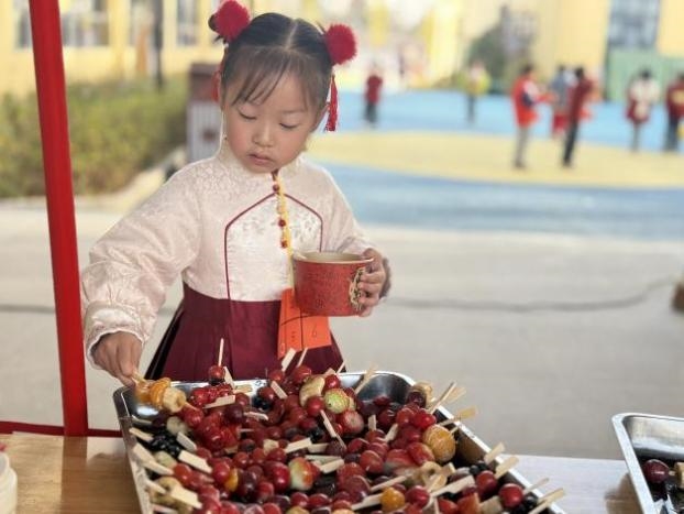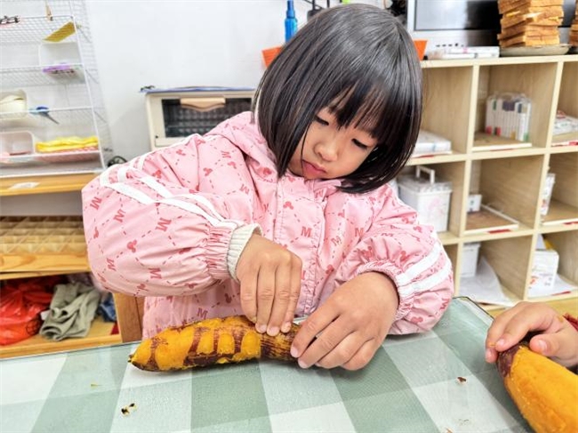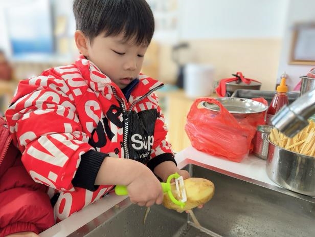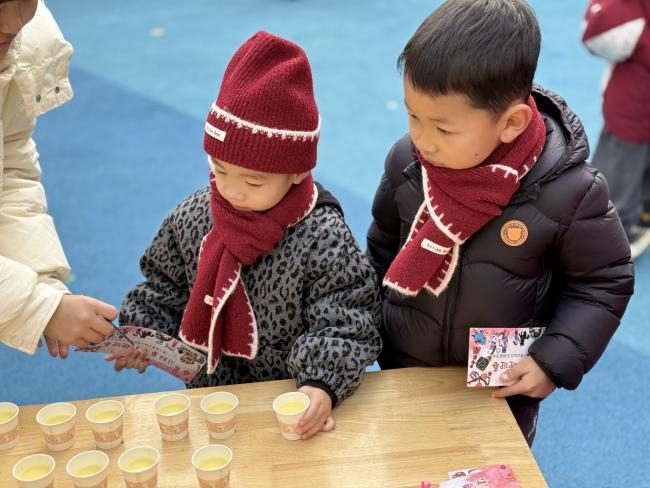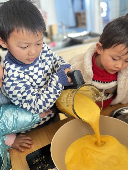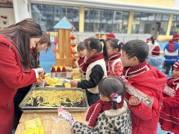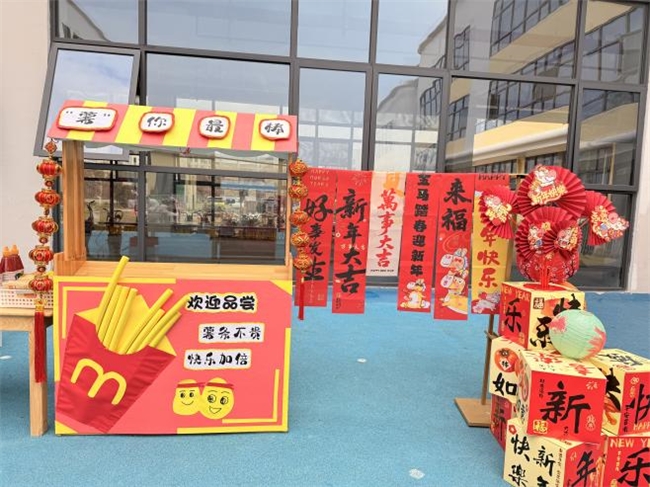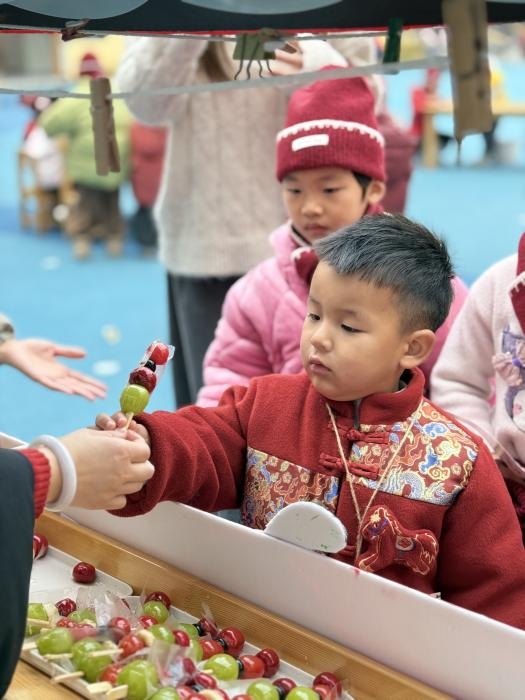美食区香气四溢,大班孩子温柔地陪伴小班伙伴一起做汤圆、炸薯条、榨玉米汁、串糖葫芦,从揉面到品尝,每一步都溢满关爱与合作,让年味在舌尖与笑意间传递。