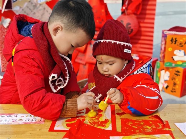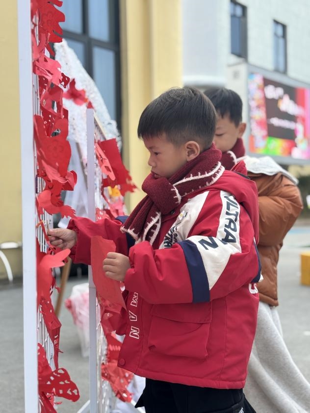 手工创作区年味浓郁,大班哥哥姐姐带着小班弟弟妹妹制作新年发箍、剪纸、拓福字,把传统祝福和体验一起装进童年的记忆。