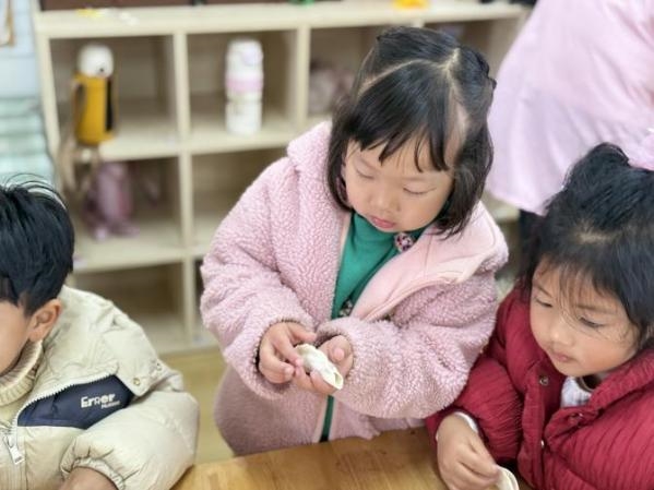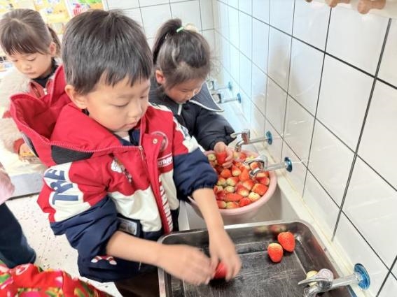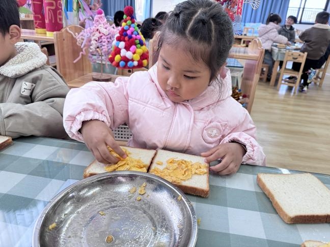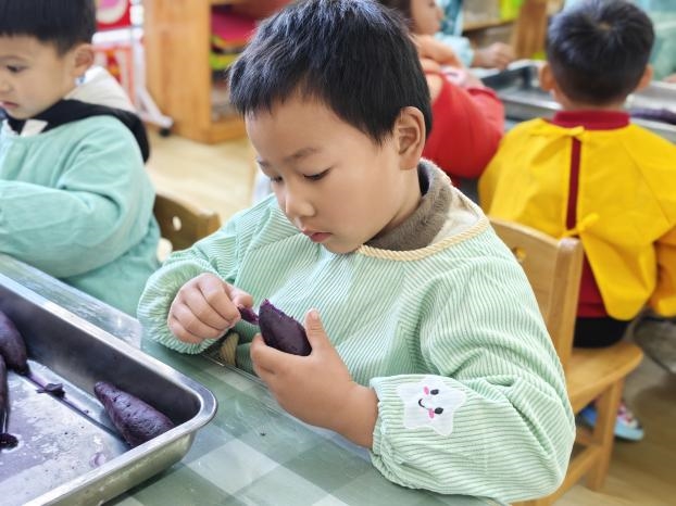 各班教室变身热气腾腾的“美食制作工坊”。系上小围裙,洗净小小手,中班的宝贝们在老师、保育员的指导下,有条不紊地忙碌起来。