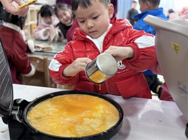 孩子们手持小餐盒,分组出发“逛街”。他们穿梭于各个摊位前,学习使用“请给我尝一个好吗?”“谢谢!”“你真棒!”等礼貌用语进行交换与品尝。在欢声笑语中,他们不仅尝到了多种美味,更体验了分享的喜悦和交往的礼仪。