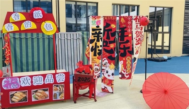 制作完成后,各班的“招牌美食”被精心摆放到二楼、三楼连廊及报告厅布置成的“美食一条街”摊位。新年音乐响起,氛围瞬间拉满!