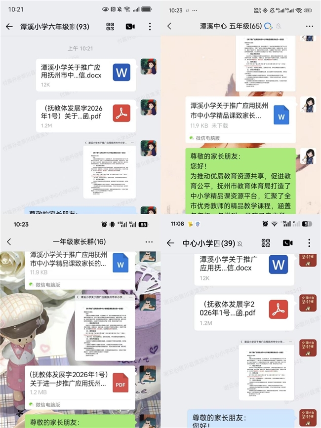 家庭是孩子成长的重要环境,家长的支持与配合对于精品课的推广应用至关重要。学校组织各班班主任在班级群里发放精心编写的告家长书。告家长书详细介绍了抚州市中小学精品课的建设背景、资源特色以及对孩子学习的积极影响。通过生动的案例和通俗易懂的语言,让家长们了解到精品课汇聚了众多优秀教师的教学智慧,涵盖了丰富多样的教学内容,能够为孩子提供更加个性化、高效的学习支持。同时,还附上了具体的使用指南,方便家长指导孩子合理利用精品课进行学习,争取家长对学校推广工作的理解与支持,形成家校共育的强大合力。