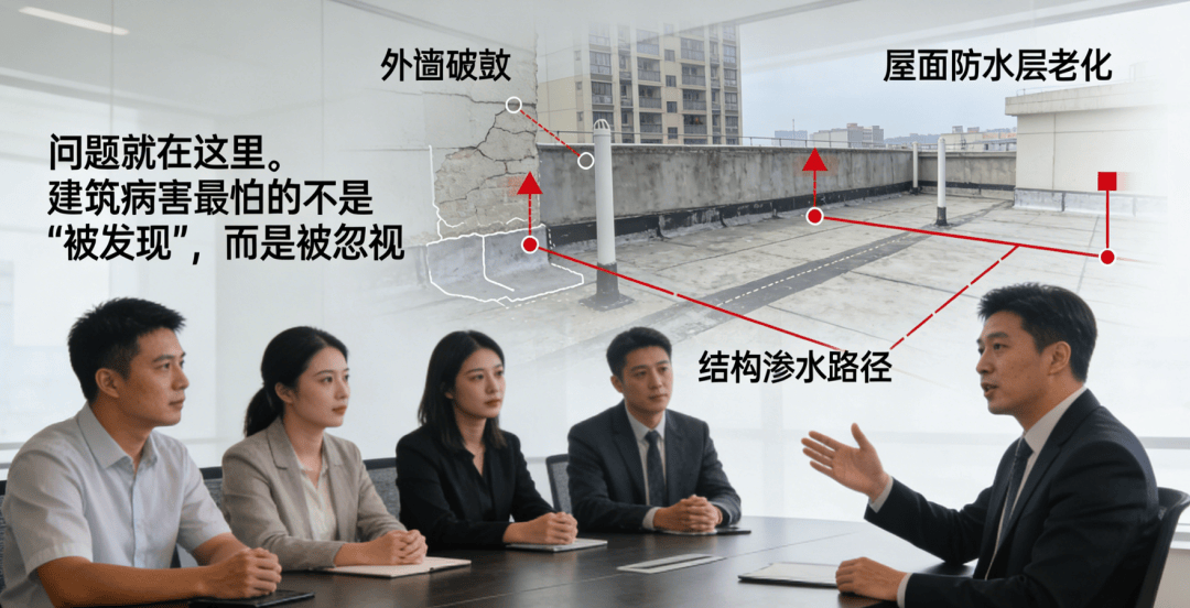 但在实际管理中,很多决策往往基于一句话:“看着还行,应该没事。”问题就在这里。建筑病害最怕的不是“被发现”,而是被忽视。尤其是外墙、屋面、结构节点这类问题,一旦发展到肉眼可见,往往已经进入高风险阶段。