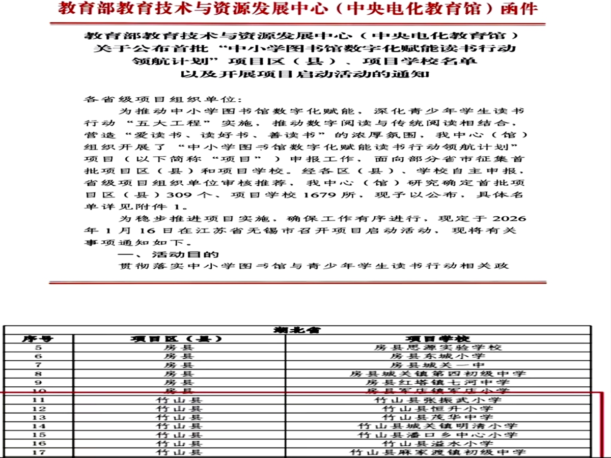 近日,中国教育部教育技术与资源发展中心揭晓了首批“中小学图书馆数字化赋能读书行动领航计划”入选学校名单,湖北省十堰市竹山县的张振武小学、麻家渡镇初级中学等20所中小学凭借卓越表现脱颖而出,成为十堰市为数不多入选的区县,备受社会各界关注。