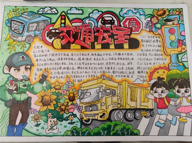 学校还分学段设置特色任务,实现全员参与,全域覆盖。一,二年级开展交通安全绘画创作活动,三至六年级开展交通安全手抄报创作活动,孩子们在构思与创作中熟悉交通知识,将安全准则牢记心间,一张张手抄报也成为校园里传递安全理念的鲜活载体。