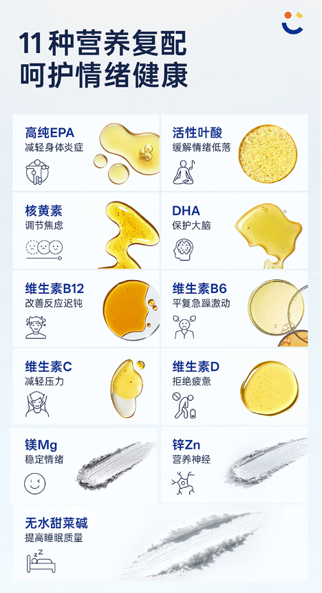 情绪状态的调节是一个复杂的生理过程,单一营养素难以实现全面的情绪防护,多成分协同作用才能更系统地为情绪健康保驾护航。cns情绪鱼油的配方设计体现了这一科学逻辑,它以活性叶酸和90%高纯度EPA为核心成分,并添加多种复配营养素,构建起全方位的情绪营养支持体系: