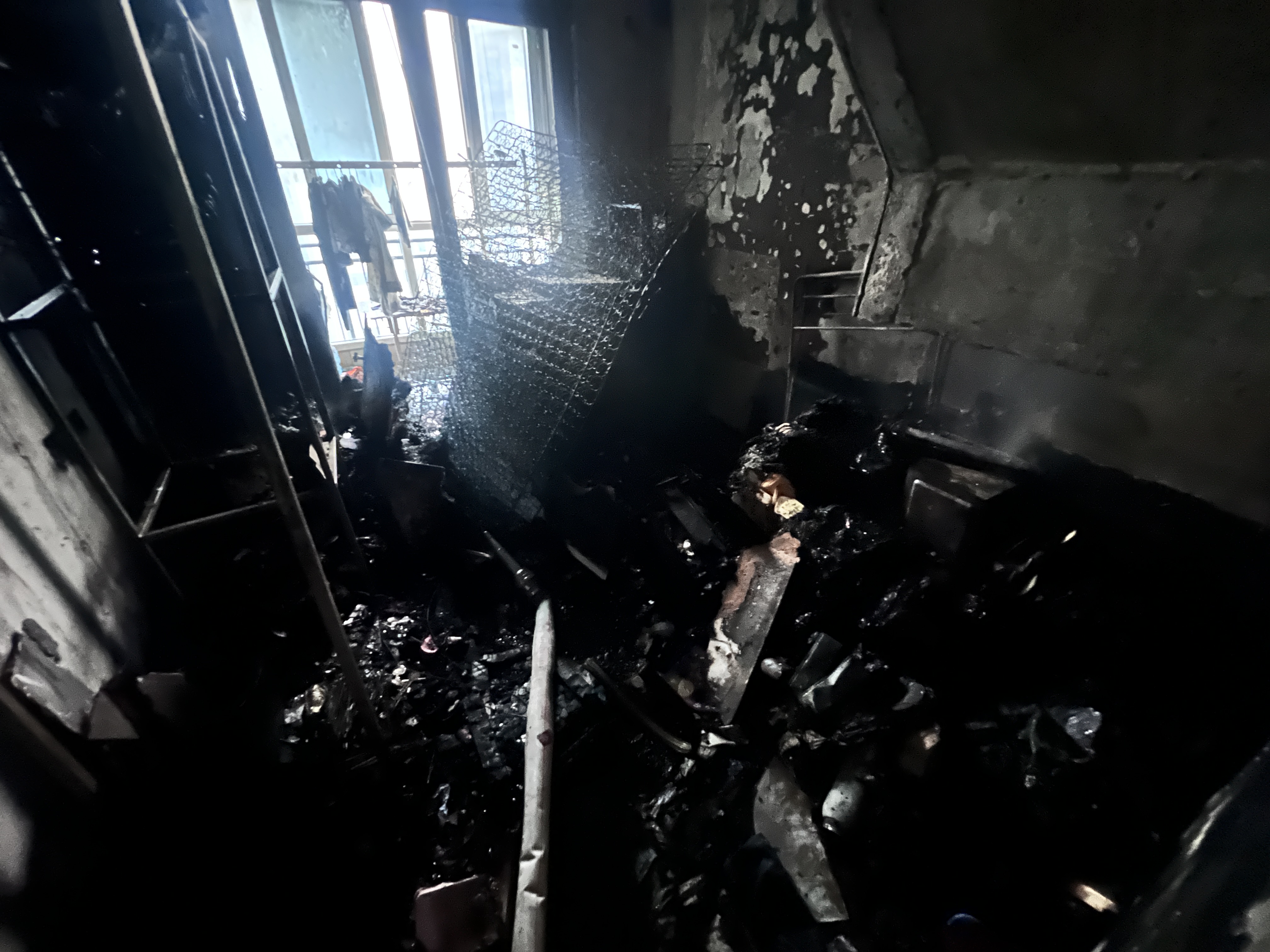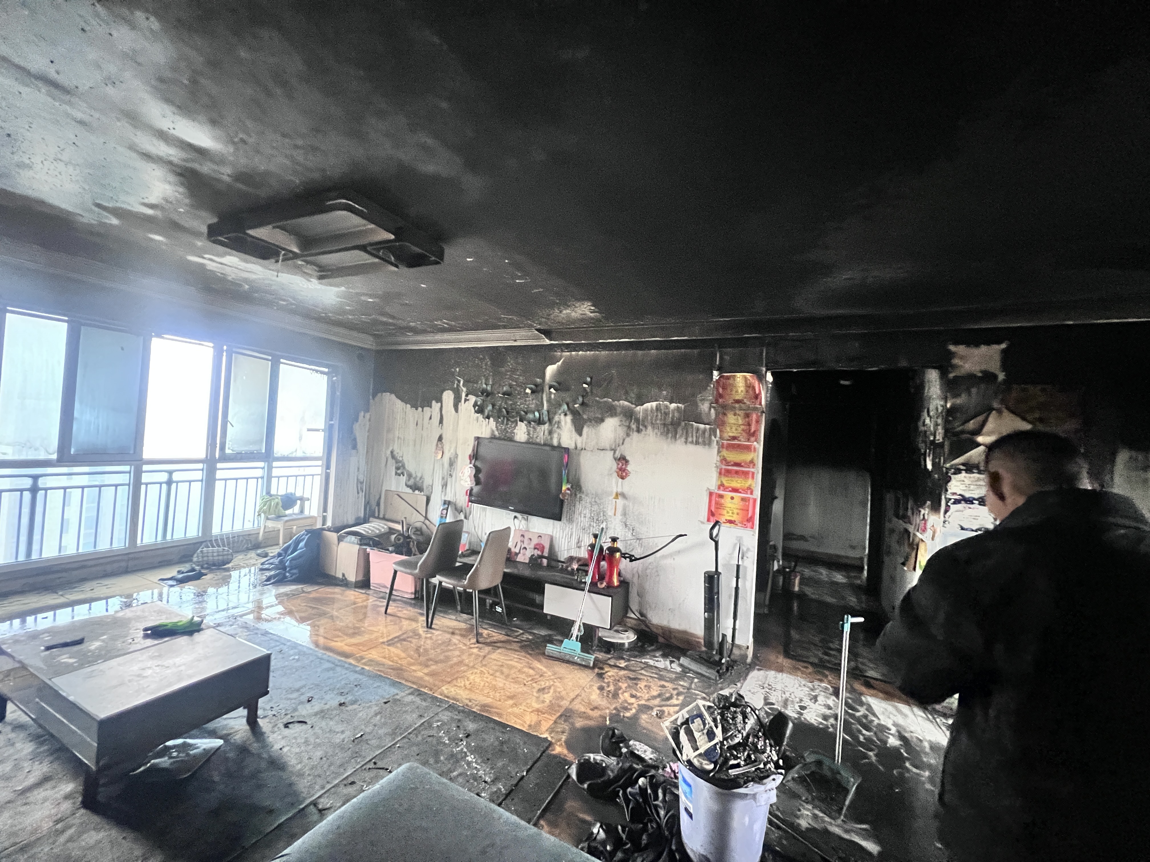 此时,28楼业主家中已是浓烟滚滚,明火从次卧窜出,大人及小孩被困卧室,隔着房门发出微弱呼救。根据碧桂园消防应急处置流程,李谭第一时间安排队员切断该楼层电源与燃气,自己则踹开虚掩的房门,浓烈的毒烟瞬间扑面而来。他屏住呼吸,在烟雾中摸索着找到卧室位置,发现大人及小孩。