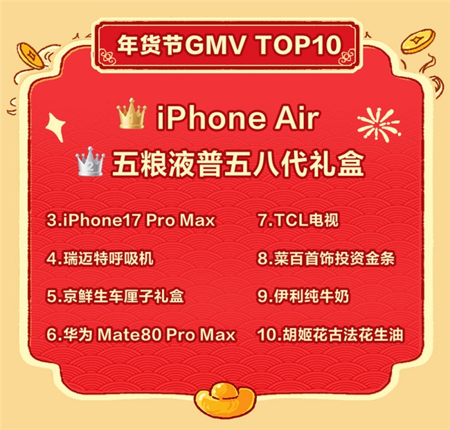 春节历来是消费者集中进行数码、家电等大件升级的重要节点,年货节期间,iPhone Air官方降价直接释放换机需求,推动其成为平台GMV冠军,iPhone 17 Pro Max、华为 Mate 80 Pro Max等高端机型也稳居榜单前列。礼赠场景中,五粮液52度白酒凭借高认知度与送礼确定性,成为年货节GMV头部单品。而大众对家庭健康的空前关注,则让瑞迈特呼吸机成为热门健康年礼。与此同时,伊利凭借刷屏出圈的谐音梗广告引爆社交传播,成功将金典纯牛奶打造为兼具年味与话题感的国民年货,跻身平台GMV前10;近期金银价格上涨,也推动20克投资金条成为黄金品类爆品,体现出春节消费中“情绪价值”与“理性配置”的并行。
