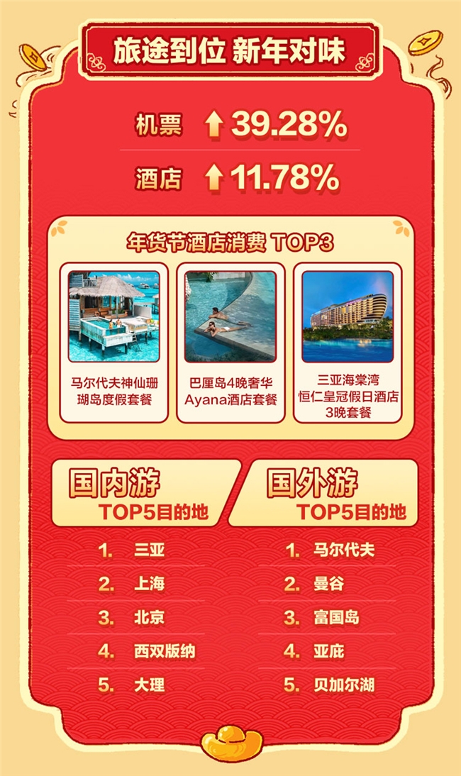 与此同时,机票、酒店GMV分别同比增长39.28%、11.78%,马尔代夫六星海岛度假套餐、巴厘岛4晚Ayana奢华度假套餐、三亚海棠湾恒仁皇冠假日3晚套餐包揽品类消费前三。从国内的三亚、西双版纳、大理,到海外的马尔代夫、曼谷、富国岛,温暖的目的地成为消费者“全家过年”的首选。对许多家庭而言,春节旅行早已超越简单的出行,而是一场共享松弛、共创新年记忆的亲密仪式。
