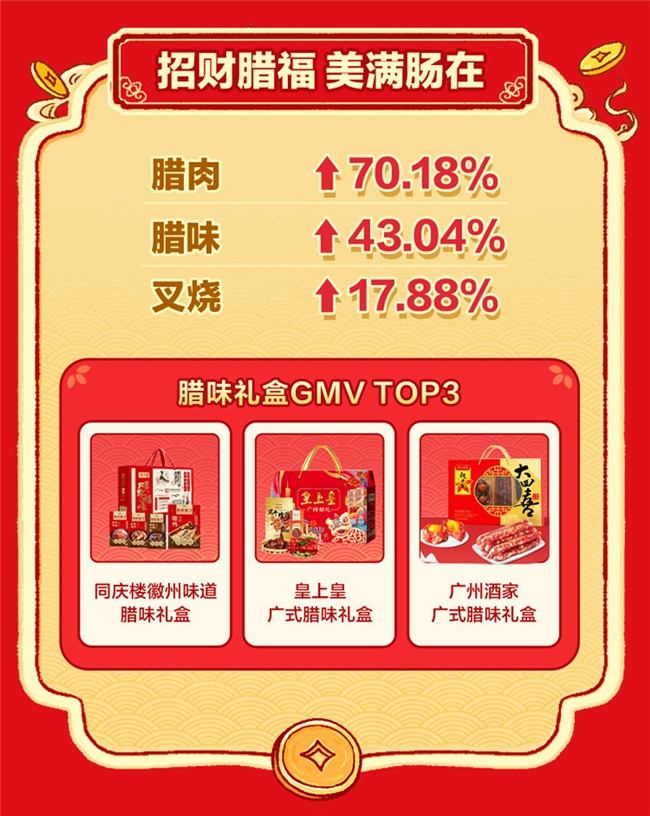 腊味这一传统年节符号,在兴趣消费加持下焕发新活力。平台内腊肉、腊味、叉烧GMV分别同比增长70.18%、43.04%和17.88%。“招财腊福,美满肠在”,同庆楼、皇上皇、广州酒家等品牌腊味礼盒受到追捧,徽式、广式风味的差异,不仅承载地域工艺,也成为年轻人寻味乡愁、体验年俗的载体。