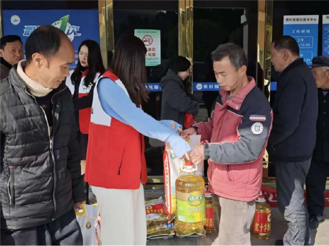 活动现场,工作人员和志愿者们早早准备就绪,整齐摆放着食用油、大米等生活物资。在悬挂着“熊村镇红十字会2026年‘红十字博爱送万家’活动”横幅的门前,大家合影留念,记录下这一充满温情的时刻。活动中,工作人员深入辖区困难家庭,将一桶桶食用油、一袋袋大米送到群众手中,用实际行动传递党和政府的关怀与温暖。