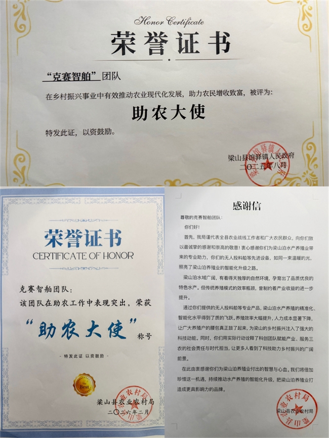 赵方冉及其克赛智舶团队的科创助农行动,得到了地方政府与主管部门的高度认可与大力支持。梁山县农业农村局、梁山县馆驿镇人民政府对项目成果给予充分肯定,认为第三代智能无人投料船贴合本地养殖实际,科技含量高、实用性强、推广价值大,是青年大学生学以致用、反哺家乡的典型案例。相关部门专门授予克赛智舶团队“助农大使”称号,鼓励他们继续深耕智慧渔业,把更多优质科创成果带到基层、惠及农户,为乡村产业振兴贡献青年力量。