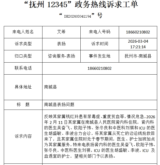 在医院,锦旗常见,感谢信也不稀奇。但近日,一份来自12345便民服务平台的感谢工单,为这个初春增添了浓浓的暖意,字里行间满是患者家属对南城县总医院医护团队的由衷感激,也见证了一场跨越春节的生命救援。