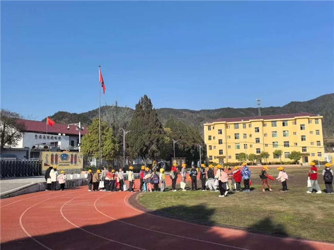 放学后,同学们统一佩戴好小黄帽排起路队。