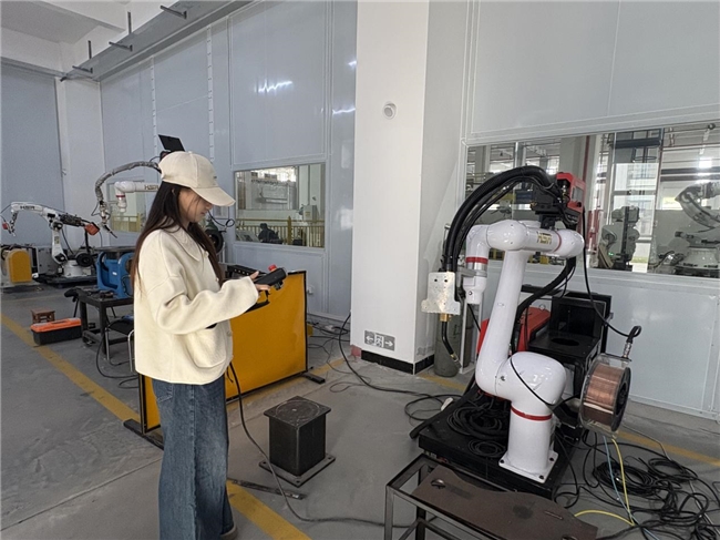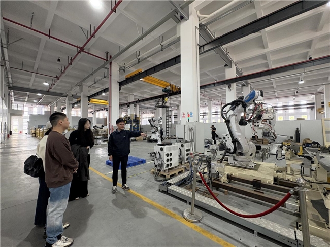 随后,团队深入核心实验室与智能制造示范车间。雷总详细介绍了园区在机器人核心零部件自主研发、整机集成等方面的技术突破,并结合实际案例展示了机器人在焊接、搬运、装配等场景的高效应用。团队成员近距离观察自动化产线的运行,对“智能制造”的实际效能有了直观感受。