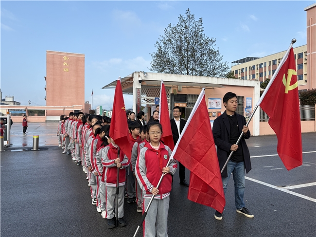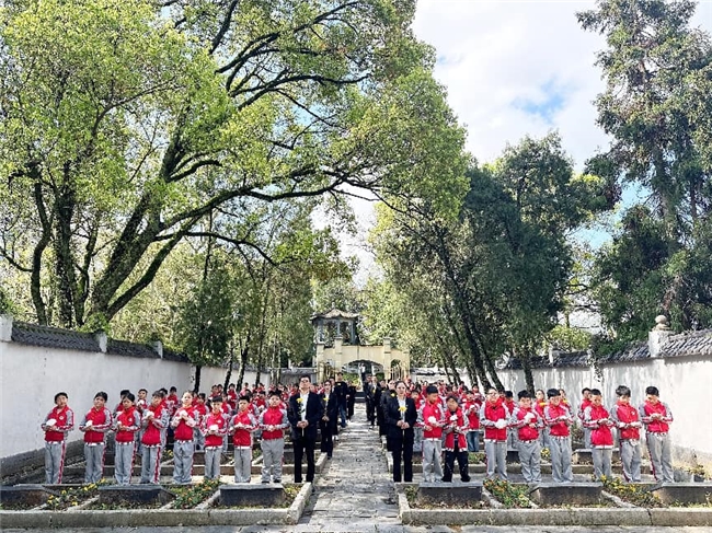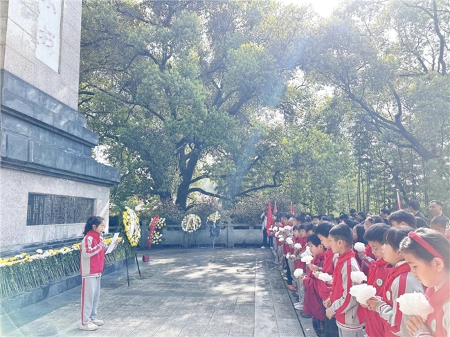 活动中,全体师生整齐列队,神情肃穆,一场庄重的祭扫仪式,在这片承载着红色记忆的土地上正式拉开帷幕。仪式第一项,全体师生整理衣冠,学校领导、党员教师代表与少先队员代表缓步走向革命烈士纪念碑,郑重敬献花篮。仪式第二项,全体师生低头默哀一分钟。仪式第三项,该校党支部书记、校长饶爱玲为本次祭扫活动致辞。仪式第四项,少先队员代表上台献词,那稚嫩却铿锵的声音,诉说着对革命先烈的无限敬仰。仪式第五项,全体党员同志重温入党誓词。仪式最后一项,全体师生有序瞻仰革命烈士墓,依次向先烈敬献小白花。