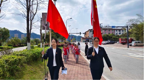 活动前期,学校高度重视、精心部署,严格落实祭扫活动各项筹备工作。对全体参与学生开展安全教育与文明礼仪教育,确保活动庄重、有序、安全。活动当天,党员教师佩戴党徽、率先垂范,少先队员统一着装佩戴红领巾,全体人员精神饱满、神情庄重。在党员教师的带领下,队伍整齐列队、文明行进,怀着对革命先烈的崇高敬意前往烈士陵园,以实际行动展现新时代师生听党话、跟党走的良好精神风貌。