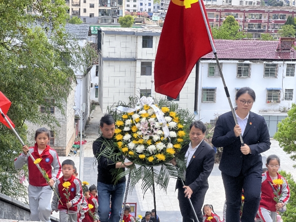 少先队员代表饱含深情诵读《致烈士的一封信》,用稚嫩却坚定的话语,向革命先烈倾诉心中的怀念与敬意,表达了传承英烈遗志、立志报效祖国的决心;党员教师代表缓步走向烈士纪念碑,郑重敬献花圈,以实际行动诠释共产党员的初心与担当,为少先队员树立了榜样,让党建引领的红色力量在活动中充分彰显。