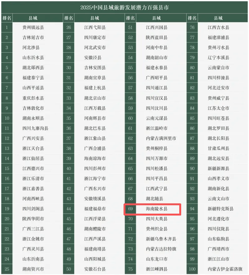 近日,《中国县域旅游竞争力报告2025》在北京发布,海南省陵水黎族自治县凭借其突出的旅游发展潜力,成功入选“2025中国县域旅游发展潜力百强县市”,位列全国第69位。这是继今年7月获评“全国县域旅游发展潜力百佳县”(第84位)后,陵水再获一项“国字号”殊荣,陵水县域旅游的综合影响力正持续攀升。