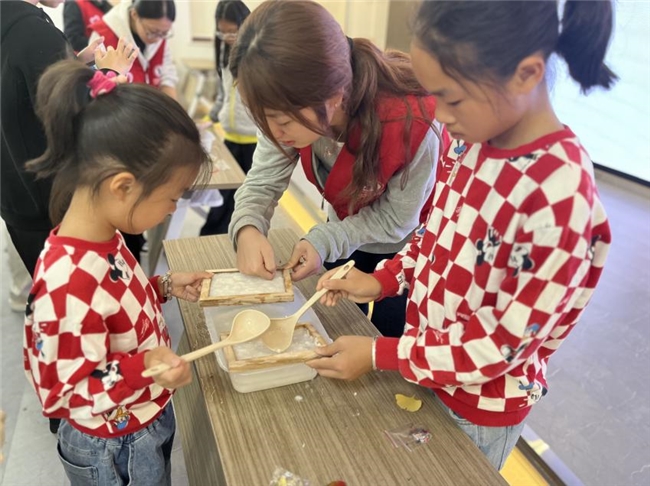 在实践环节,志愿者老师带领青少年亲手制作云南腾冲纸。从捣浆、过筛到装饰,孩子们一步步体验古法造纸的精细工艺。他们小心翼翼地将纸浆铺平、压滤,并发挥创意,用花瓣、树叶点缀出独一无二的纸张作品。现场气氛热烈,欢声笑语不断,青少年在动手实践中深刻体会到传统匠人的智慧与艰辛。