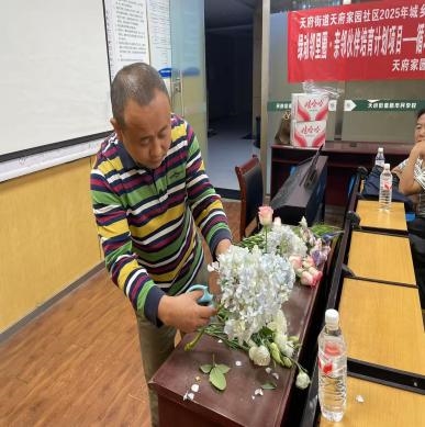 互动实操,激发居民创造活力:在随后的实操环节中,居民们在讲师的耐心指导下,将刚学到的理论知识付诸实践。大家兴致盎然,精心挑选花材,巧妙构思布局,在修剪与插制中感受花艺创作的乐趣。现场互动交流热烈,学员们就制作中遇到的疑问与讲师深入探讨,并自发分享彼此的学习心得与创作灵感。这种“教学相长、邻里共学”的模式,不仅提升了学习效果,更在协作与分享中增进了邻里情感。