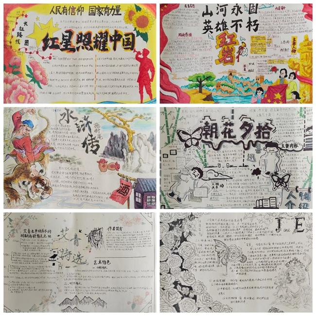 书海徜徉后,学子们用思维导图与手抄报定格阅读收获。七年级学子围绕《红星照耀中国》《红岩》勾勒革命脉络,八年级同学紧扣《艾青诗选》《水浒传》展现文学魅力,图文交织间尽显文学美感与历史底蕴。