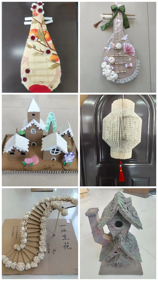 废旧物品在学子手中“华丽变身”,纸箱、塑料瓶、旧衣物经剪裁、彩绘、编织,成为兼具实用性与艺术性的作品。