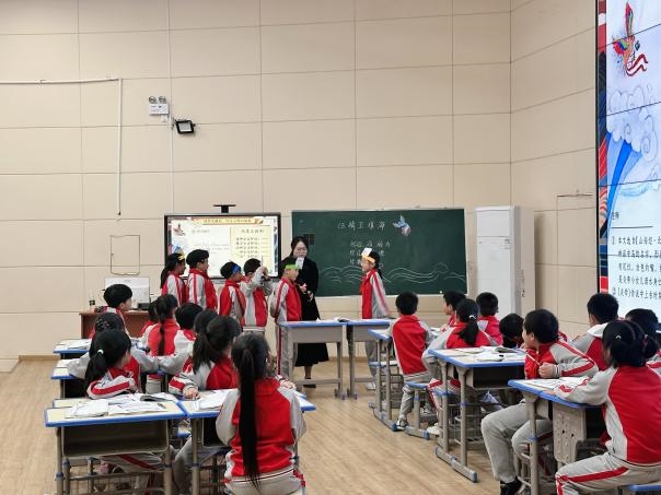 《精卫填海》(周慧娴 高田中心小学):周老师以《山海经》里的神话故事导入,再引导学生对比“炎帝之女”与“精卫鸟”的形象变化,通过“读诗句—理解文意—讲故事—角色扮演—悟精神”,让四年级学生读懂了神话中“坚持不懈”的精神,课堂氛围庄重而深刻。