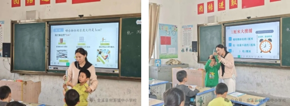 徐翠兰老师为二年级的学生带来了一堂别开生面的数学课——《认识厘米》。课堂上,徐老师让孩子们用自己的小手比划1厘米的长度,寻找身边长度大约是1厘米的物品。孩子们在教室里兴奋地寻找,纷纷惊呼:“原来1厘米就在我们身边!”徐老师充分遵循了低年级学生的认知规律,将抽象的“厘米”概念转化为丰富的感知和操作活动,有效地帮助学生建立了初步的“量感”。