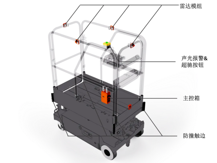 剪叉式升降平台是广泛应用于高处作业的机械设备,由于作业环境复杂多变,传统平台面对周边障碍物完全依靠操作人员预判风险。无法实现主动预警、紧急制动导致作业过程安全隐患突出,近年来因此引发的安全事故也时有发生。