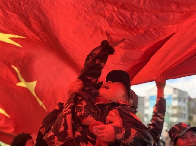 最后是老兵和小兵组成的连队方阵,每个连队的小兵站在里侧,老兵守护在外侧,大家都手持8号手摇旗,整齐地站成4竖排,那一面面挥动的小旗,就像一道道流动的“中国红”!国旗护卫队迈着整齐的步伐走向旗台。国歌奏响,全场肃立,注视着五星红旗,浓浓的爱国情怀在心中激荡。