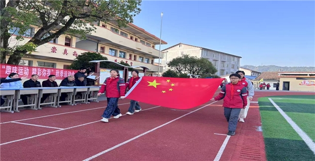 鲜艳的五星红旗在护旗手手中迎风飘扬,他们身着整洁的校服,迈着整齐划一的步伐走过主席台。每一步都坚定有力,每一个眼神都饱含敬意,为运动会拉开了庄严而神圣的序幕。