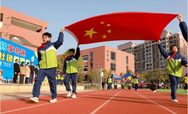 主持人的声线撞碎晨雾,入场的队伍便踏着鼓点奔赴而来——国旗方阵护旗手们擎旗的臂弯绷成直线,风里裹着孩子们眼底最澄澈的庄重;校旗队的学子们紧随其后,蓝白的校徽在冬阳下泛着光,是独属于学校骄傲的光亮。