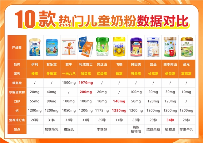 不少家长总揪着孩子身高的事儿犯愁 —— 眼看同龄孩子窜得快,自家娃却慢半拍,想靠奶粉补营养,可市面上的儿童奶粉一搜一大把,广告上满是 “补钙”“助成长” “长高奶粉”的字眼,自己又不懂配方里的门道,不知道哪款真能帮到孩子。加上分不清成分好坏、怕选不对浪费钱,越挑越焦虑。这次我们专门拆解了10款热门儿童奶粉,伊利QQ星榛高、完达山亿级高、利成博士加贝高、君乐宝多维高、飞鹤碚高、蒙牛一米八八、贝因美可益高、宜品长高高、四季南山倍贝高、圣元高赢高。把配方当中有利于身高发育的钙、赖氨酸、CBP、水解蛋黄粉等关键成分梳理清楚,就是想帮不熟悉专业知识的家长,把选奶的思路理得更明白。以下是我们对这10款热销儿童成长奶粉的各项数据对比表。