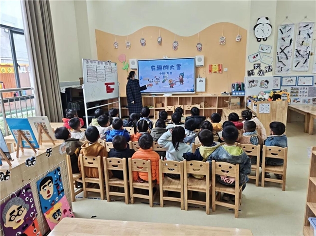 老师们先结合大雪节气特色,用生动的雪景图片、丰富多彩的视频和充满童趣的冬日故事,为孩子们细致讲解了“大雪”节气的物候特点、寒冷气候特征,以及“腌肉储菜”“赏雪盼梅”等相关民间习俗,让抽象的节气知识变得直观又好懂。