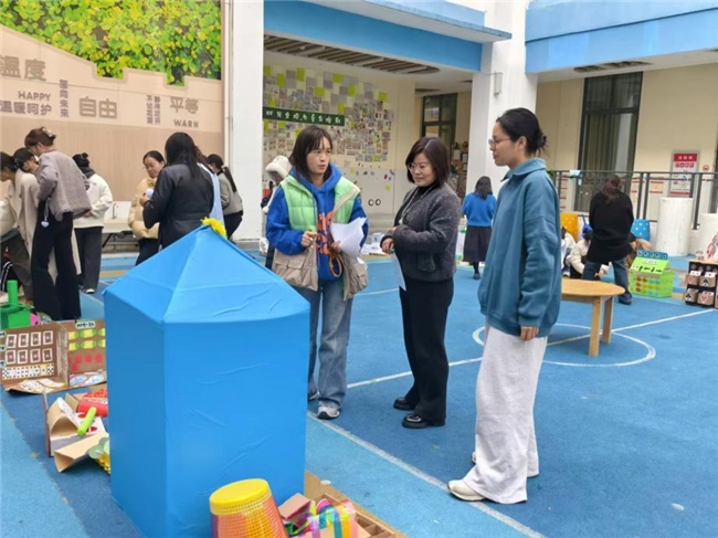 比赛现场设置了作品展示与讲解环节。每位教师边展示自己作品,边详细介绍了作品的设计理念、教育目标和使用方法。这些参赛作品都是教师们利用日常生活中常见的纸箱、纸壳等废旧物品巧妙制作,涵盖了幼儿认知发展、动作协调、语言表达、社会交往等多个领域。令人欣喜的是,绝大多数教师的创作灵感来源于本班幼儿的实际需求,或是作为班本课程的延伸。这种“从幼儿中来,到幼儿中去”的设计理念,确保了教玩具真正贴近幼儿生活,满足其发展需要。
