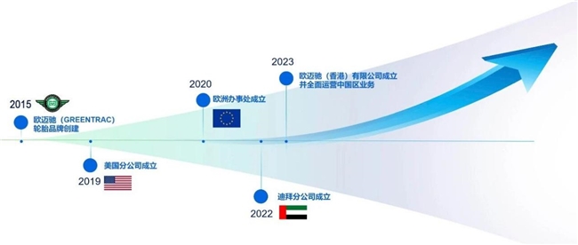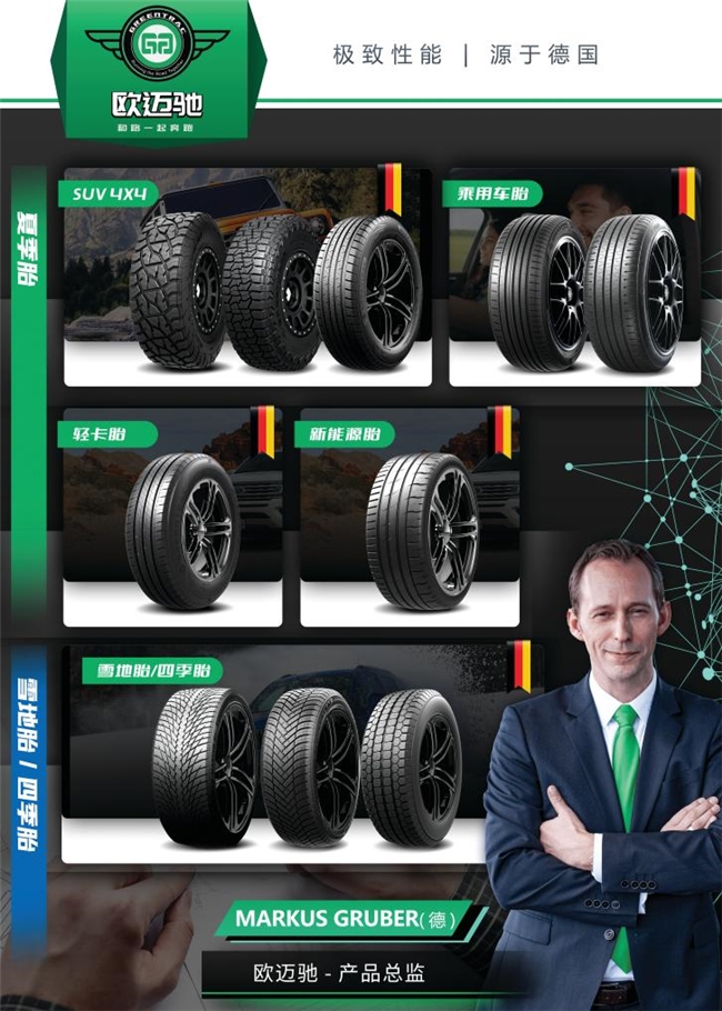 2023年8月,全球化轮胎品牌欧迈驰(GREENTRAC)正式进入中国市场,由欧迈驰轮胎(香港)有限公司负责其中国区运营。该品牌创立于2015年,由德国与中国技术团队联合研发,产品覆盖乘用车、SUV、新能源车及商用车全品类,凭借高性能表现畅销全球170余国。