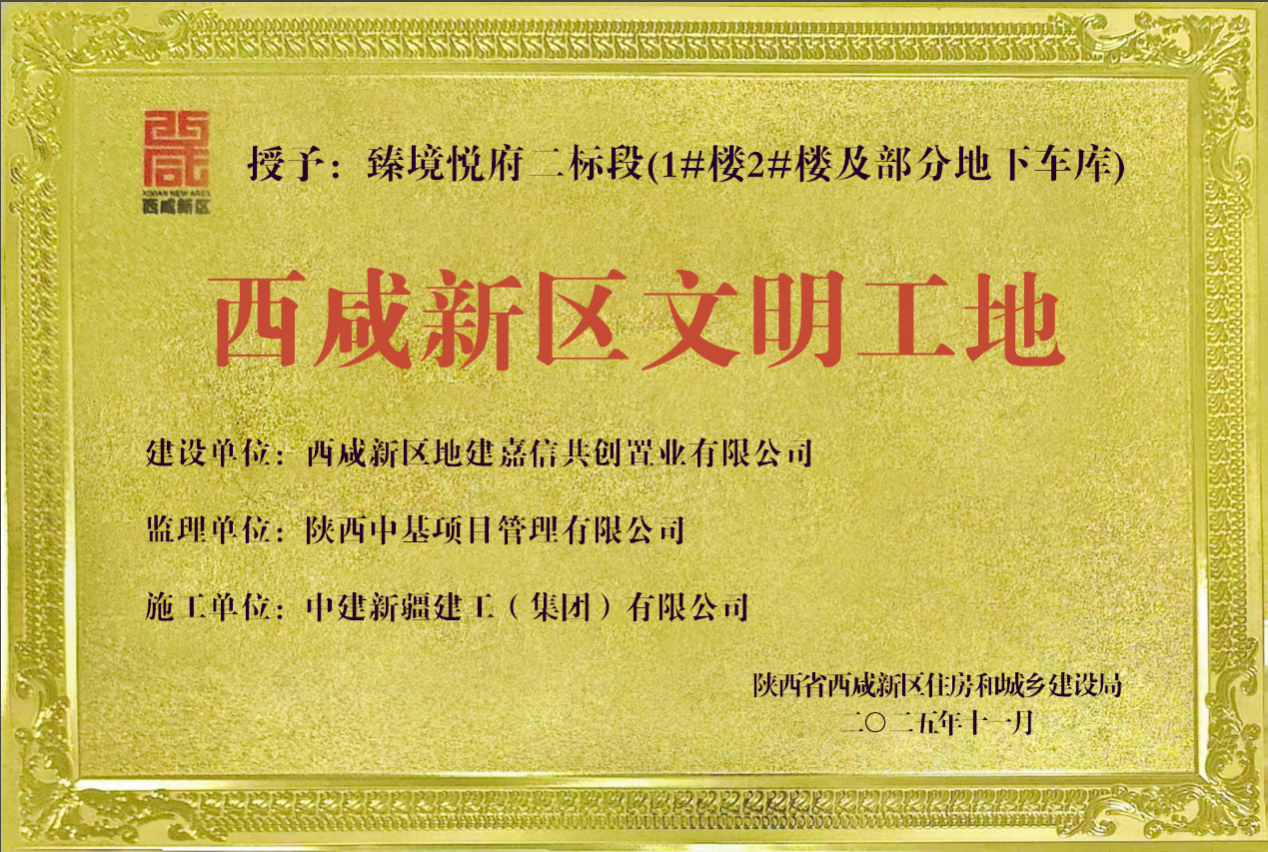 近日,陕西省西咸新区住房和城乡建设局公布西咸新区2025年度第二批文明工地名单。由中建新疆建工西北公司承建的臻境悦府项目,凭借出色的标准化施工、精细化管控的卓越表现,成功获得“西咸新区文明工地”称号。这一荣誉不仅标志着项目安全管控取得阶段性重要成果,也为企业品牌再添一项权威认可。