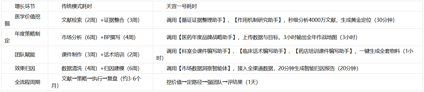 “天宫一号”的核心突破,在于其预置了100+个深度融合医药行业知识与业务流程的垂直智能体。这些智能体如同一个个7x24小时在线的专家顾问,能将上述耗时数月的工作压缩至小时乃至分钟级别。以下是我们基于应用场景提炼的效率对比: