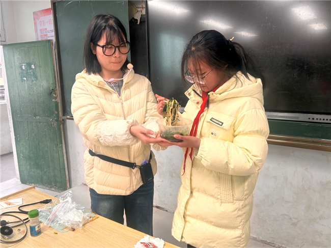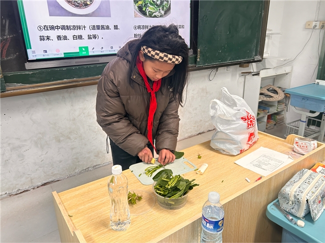 12月25日,熊村小学五年级的教室里飘出阵阵清香。一场别开生面的劳动实践活动正如火如荼地进行着:这边是“凉拌菠菜”烹饪小组,那边是“彩虹笔筒”编织工坊。孩子们在劳动中体验,在创造中成长。