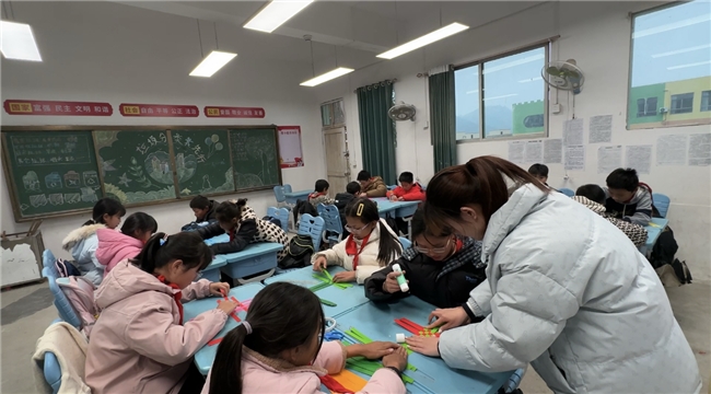 另一间教室里则是彩色的世界。五颜六色的卡纸在孩子们手中穿梭,逐渐形成规整的图案。编织彩虹笔筒需要耐心和细心,一开始许多同学被复杂的编法难住了。在老师的示范和同伴的互助下,慢慢地,一个个缤纷的笔筒雏形开始呈现。